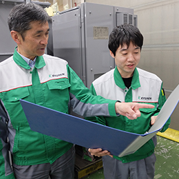 家庭から企業まで、九州一円の電力分野を支える東証プライム上場企業の九州電力グループの一員として、変圧器やEV急速充電器を中心とした様々な電力インフラ設備を製造しています。