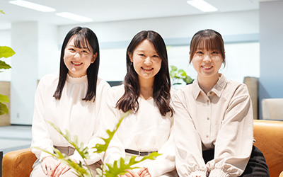 今回訪問した本社オフィスは、開放感があるミーティングスペースがあり、カフェコーナーやソファーでくつろぐ社員の方の姿もありました。中途入社した事務スタッフの方々の取材中も、笑顔で前向きに回答していただけたのが印象的です。撮影の際は、みなさん和気あいあいとさまざまなポーズをとってくれて、非常に楽しい取材になりました。