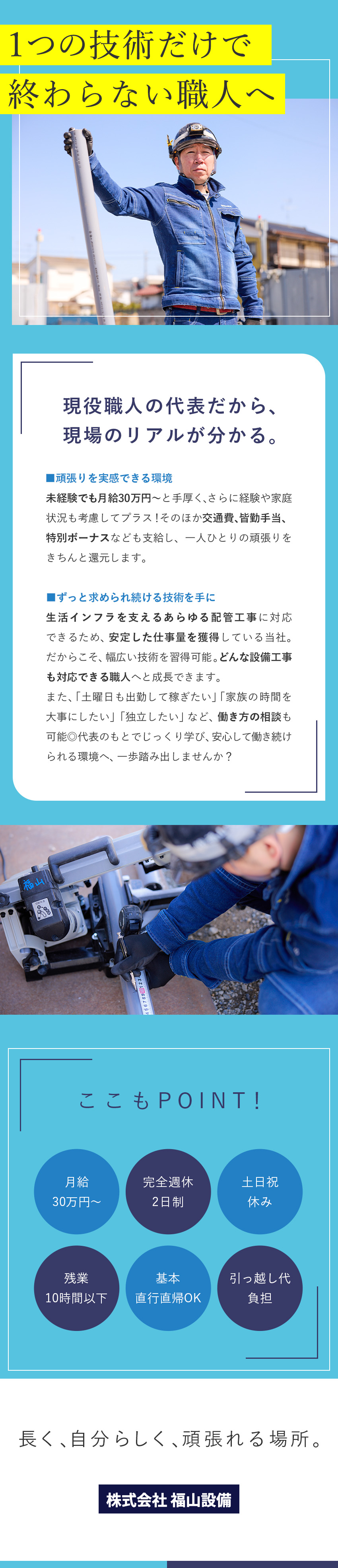 配管工スタッフ/未経験でも月給30万円~/土日祝休/面接1回