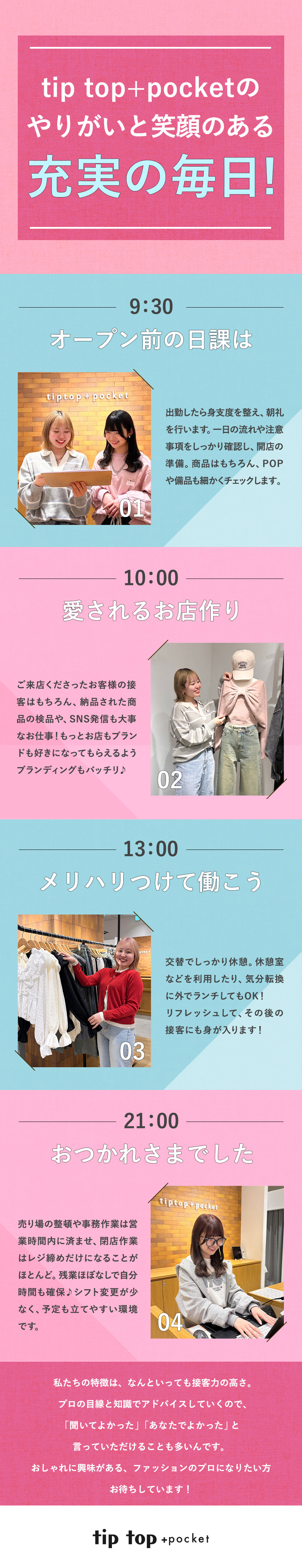 女性向けアパレルブランド「tiptop+pocket」の販売スタッフとして、