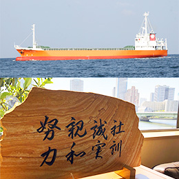 上)社船「さつき丸」、下)「誠実」「親和」「努力」を社訓と掲げる