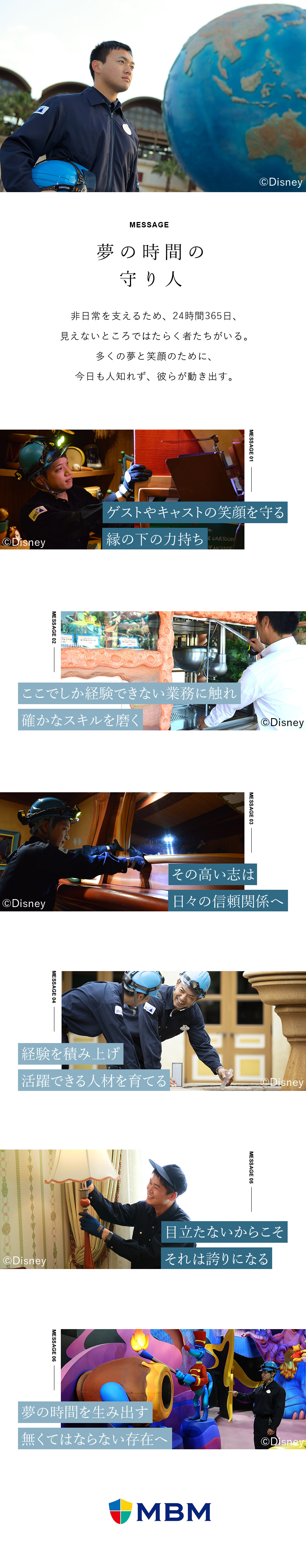 訪れる人々を笑顔にし、明日への活力を育む場「東京ディズニーリゾート(R)」。子どもだけではなく大人も魅了するテーマパークが仕事場であり、夢の舞台を支えているという誇りが大きなやりがいにつながるはずです。