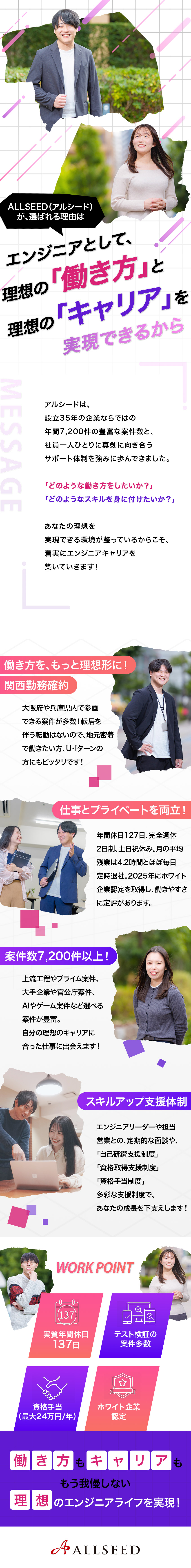 一度は開発へ進みましたが、一番面白いと感じたのは品質管理でした。ALLSEEDはテスト分野が強く、テストを極める選択を肯定してくれます。今はテスト設計に関わり、品質を守る側として誇りをもっています。