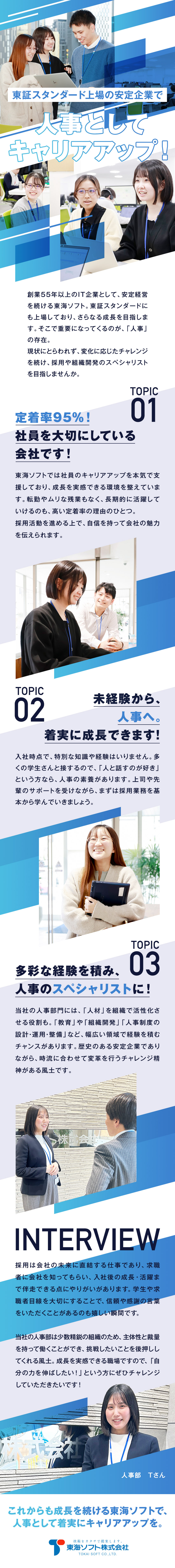 東海ソフトの定着率は、なんと95%。その背景には、長期的なキャリアアップを支援する体制と、ライフステージが変わっても活躍し続けられる働きやすい環境づくりがあるといえます。こうした高い定着率を支えているのが、今回募集する人事のポジション。事業計画に沿って人材を採用するだけではなく、その後の教育や定着に向けた施策にまで踏み込んでいく、重要な役割を果たしています。
