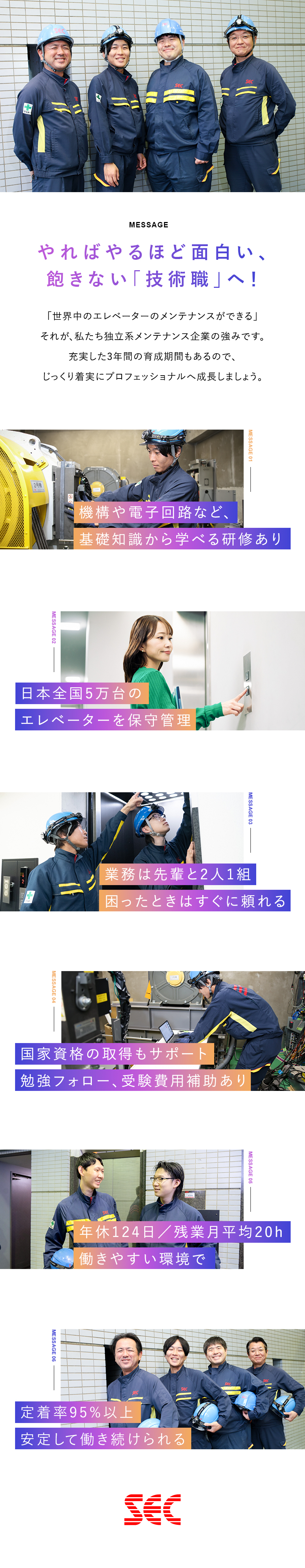 入社後は先輩社員がしっかりサポート。エレベーターメンテナンスの基礎から学べます。