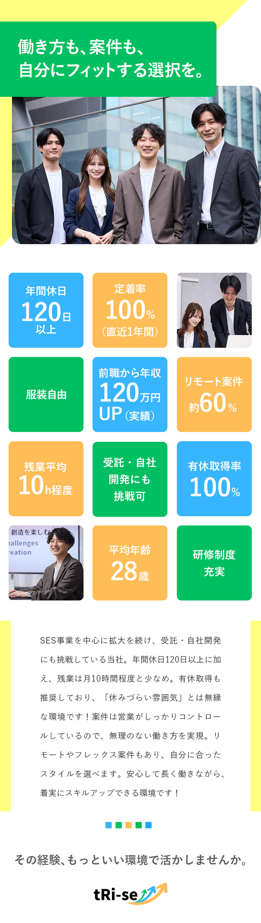 営業が案件をコントロールしており、実際に残業が少なく、しっかり休みを確保できている案件を選定しているため、無理のない働き方が実現されています。