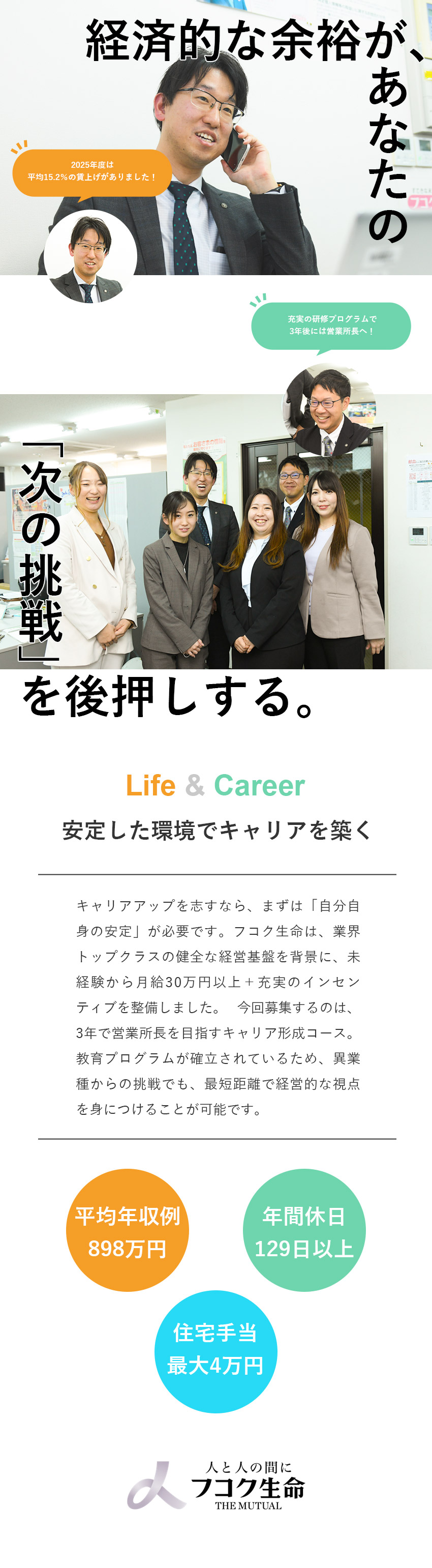 【福井】営業所長育成コース(未経験歓迎)/年間休日127日/住宅手当有/充実の研修制度/土日祝休