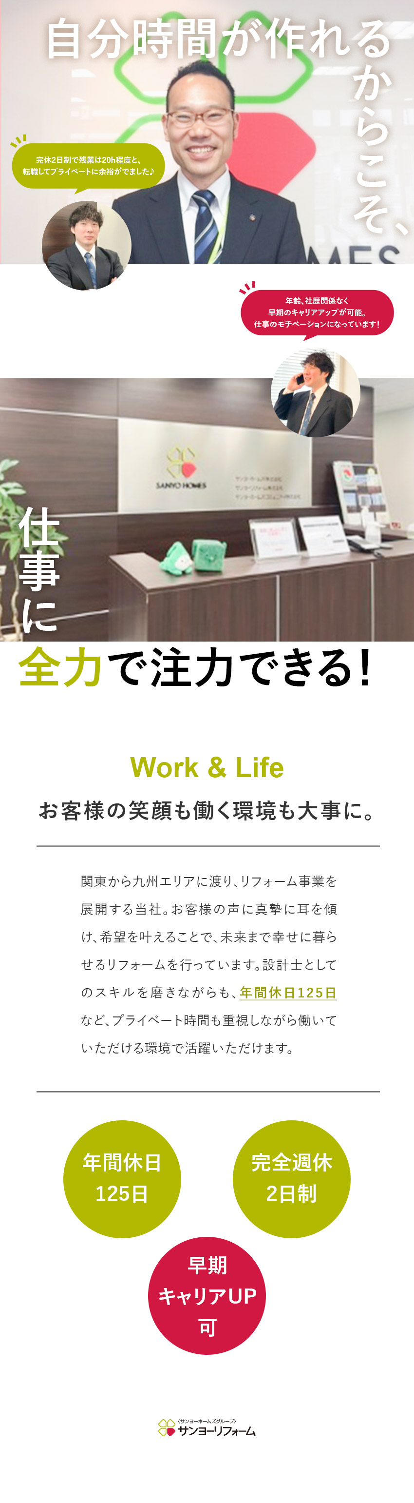 さまざまな住空間を提供するサンヨーホームズグループの一員である同社。グループの中でも、さらに成長を期待される『リフォーム分野』を担う企業です。