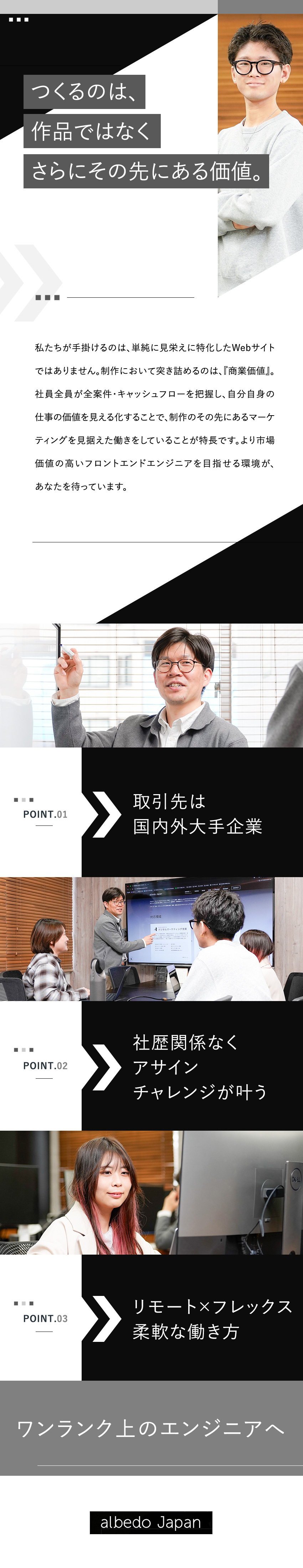 また、マーケティング視点が身に付くのは同社ならではのポイント。将来的なメンテナンスやカスタマイズに備えて制作するスキルを習得できるため、自分自身の市場価値を高めながら活躍することが可能です。