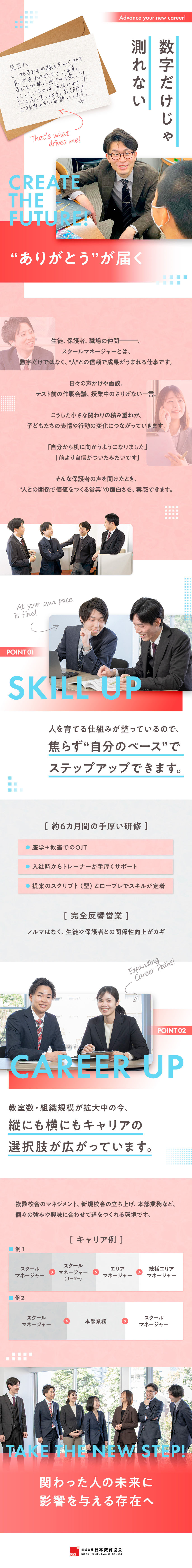 同社のスクールマネージャーは、新規開拓や強引な提案が一切なく、問い合わせをされた保護者に対し、誠実に情報提供を行う完全反響型の営業スタイルです。日々の声かけや面談を通じた信頼構築が成果につながるため、培ってきた関係構築力を存分に活かせる環境です。
