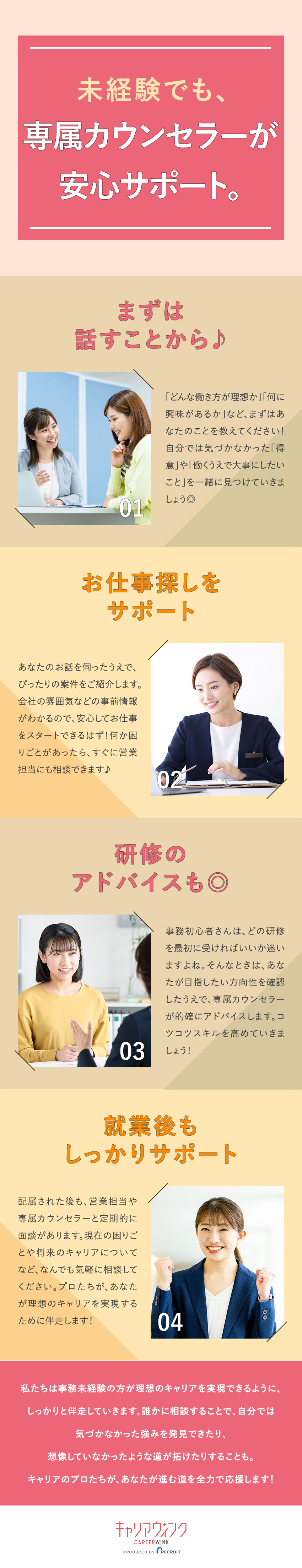 「キャリアウィンク」は株式会社リクルートスタッフィングから生まれた「未経験からの事務職へのチャレンジ」と「仕事とプライベートの両立」ができる働き方! リクルートスタッフィングの正社員(無期雇用派遣)として入社し、大手・有名企業の事務職として勤務します。