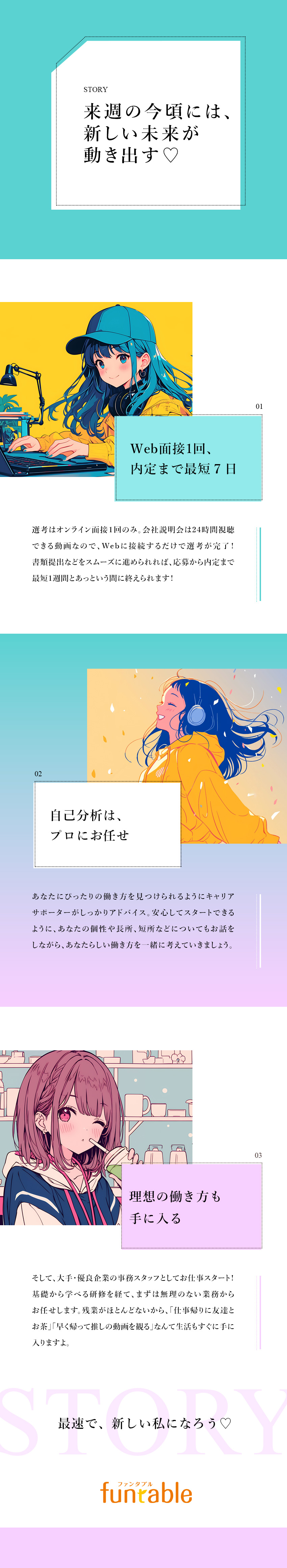 どうして事務を志望したかというと…、大学時代に接客業をしていたとき、周囲を見てサポートをすることが“得意”だと気づいたからです。事務職は表に立ってグイグイ引っ張っていくようなポジションではないですが、社員さんを陰で支えるやりがいある仕事です。なんてことない“得意”が、事務で活かせるかもしれません。ぜひファンタブルで一歩踏み出しませんか。