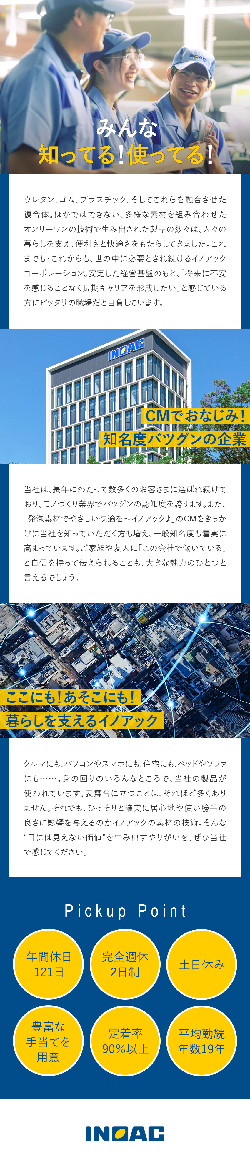 ウレタン、ゴム、プラスチック、そしてこれらを融合させた複合体。イノアックコーポレーションは、多様な素材を組み合わせた独自技術で製品を世に送り出し、人々の暮らしに便利さと快適さをもたらしてきました。「発泡素材でやさしい快適を~イノアック♪」のCMで同社を知った方も多いはずです。