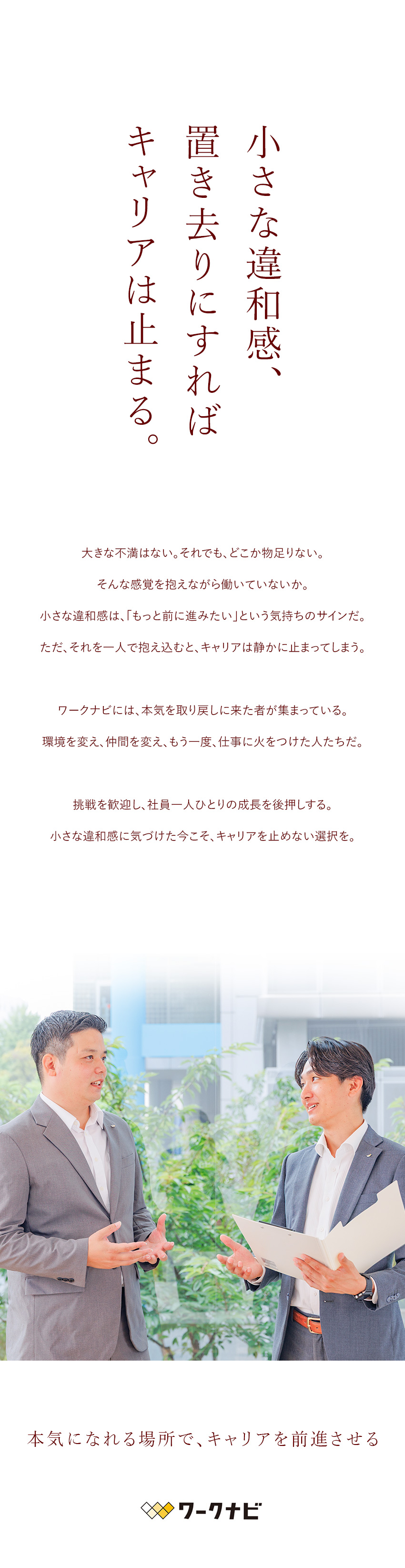 異業種から未経験で飛び込み、今では組織を率いる立場で活躍する社員。大手企業の安定を手放し、より大きな裁量とスピード感を求めて転職した社員。ワークナビには自分のキャリアと向き合い、本気になれる環境を目指して入社した社員が集まっています。挑戦が歓迎され、意欲的な社員にはどんどんチャンスを提供する会社です。