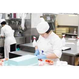 フルーツカットや計量、焼型準備などの基礎業務からスタート。