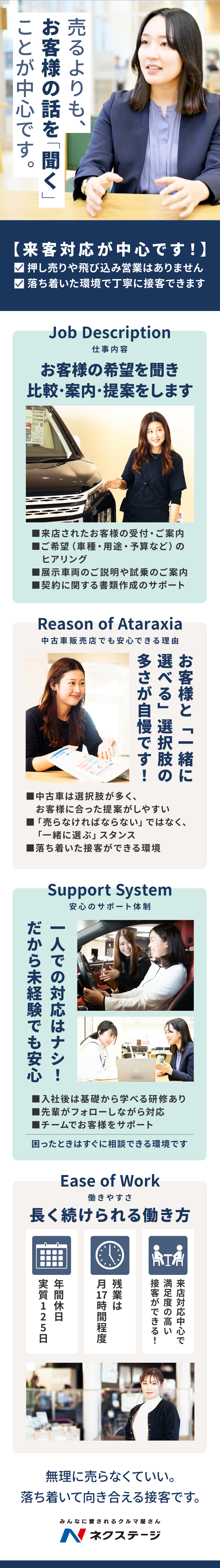 来店対応中心/お客様に合うクルマを一緒に探す接客職