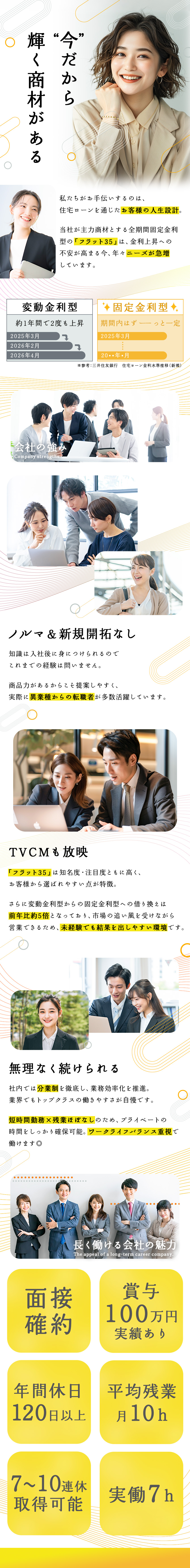 働き方の面ではとても恵まれていると思います。実働7時間で残業も少ないので、仕事終わりにも趣味を楽しむ余裕があります。住宅ローンの知識は将来にも役立つため、自分自身の成長を感じながら長く働ける仕事です。