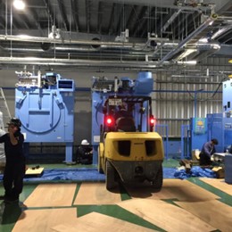こんな大型の機器を扱う案件も。フォークリフト作業は外注に出すので、設置や点検に専念できます。