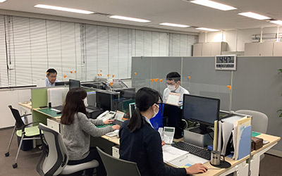 伝票作成・見積書作成・書類整理・庶務などの事務業務を行いつつ、工場で製造している接着剤原料などの受発注業務、それに伴う納期の調整など、工場や仕入れ先と連携を取りながら扱っている化学品について理解を深めていただきます。
