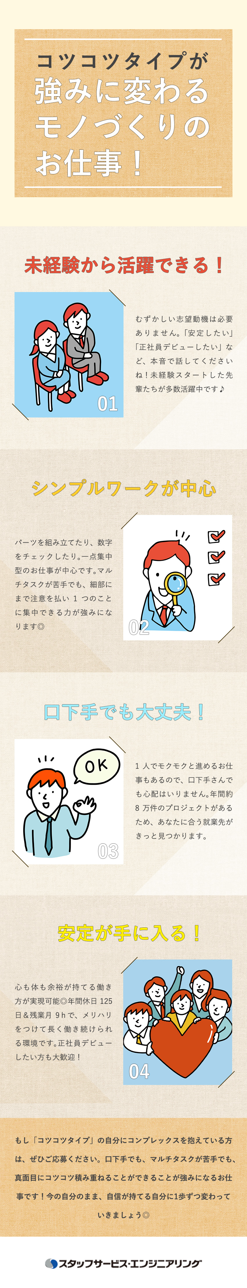 口下手な人でもまったく問題ありません。コツコツ、正確な作業を大事にできる方なら大歓迎です。将来的には、スキルを磨いて就業先企業の正社員になられた方もいます。