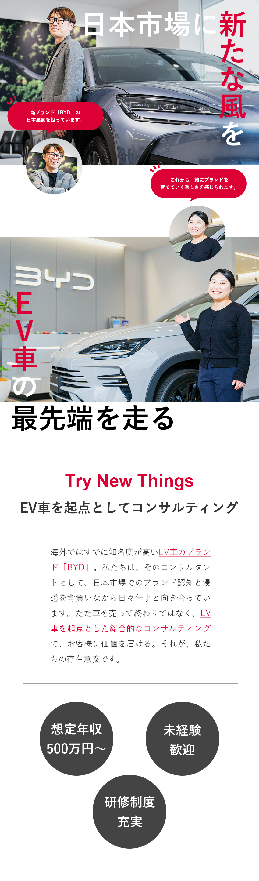 扱うのは世界的に注目を集めるBYDブランド。日本市場ではまだ拡大フェーズだからこそ、ブランドを育てていく面白さがあるのでしょう。お客様も情報感度が高く、求められるのは単なる商品説明ではなく、不安や疑問を解像度高く整理し、納得へ導く力です。その一つひとつの積み重ねが、市場の成長につながっていく。輸入車No.1を目指す挑戦の中で、自身の価値も大きく高められる環境だと感じました。