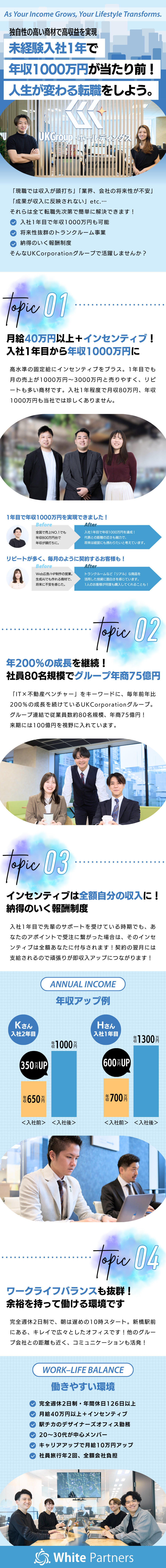 単に自社でトランクルームを運営するのではなく「不動産投資」ができる仕組みを作り、従業員数約80名(2026年1月現在)で年商75億円、数年にわたって前年比200%という高成長を維持しているUKGroupホールディングス。今回募集するのは、同グループの中核企業である株式会社White Partnersのコンサルティング営業です。