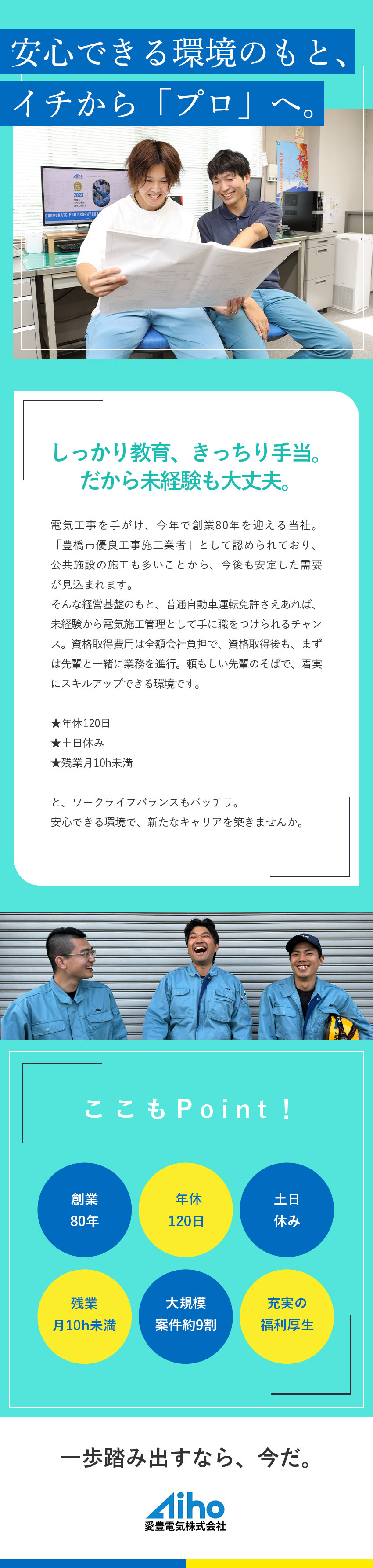 【豊橋市】※未経験歓迎※電気工事の施工管理~完全週休2日(土日)/残業10H程度/若手活躍中!