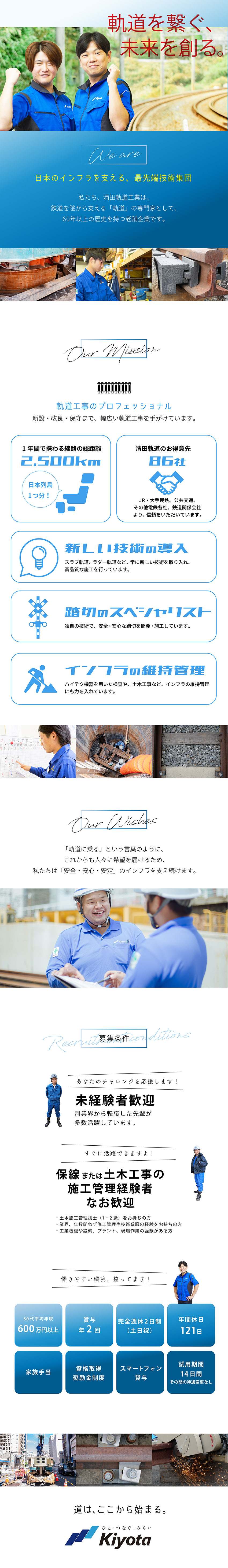 軌道の施工管理/鉄道インフラ/年休121日/技術職 進捗管理