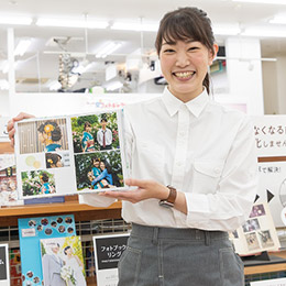 カメラやプリント方法のご案内の他、証明写真の撮影も担当しています。私の撮った写真を気に入ってくれた高校生のお客様が「写真のおかげで受験がうまくいきました」と後日報告に来てくれました。嬉しかったですね。