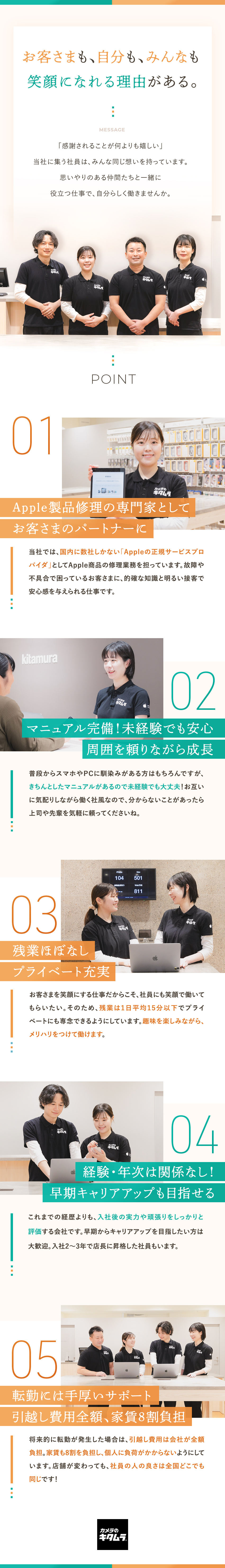 Apple製品修理受付スタッフ/月残業5H未満/家賃補助8割