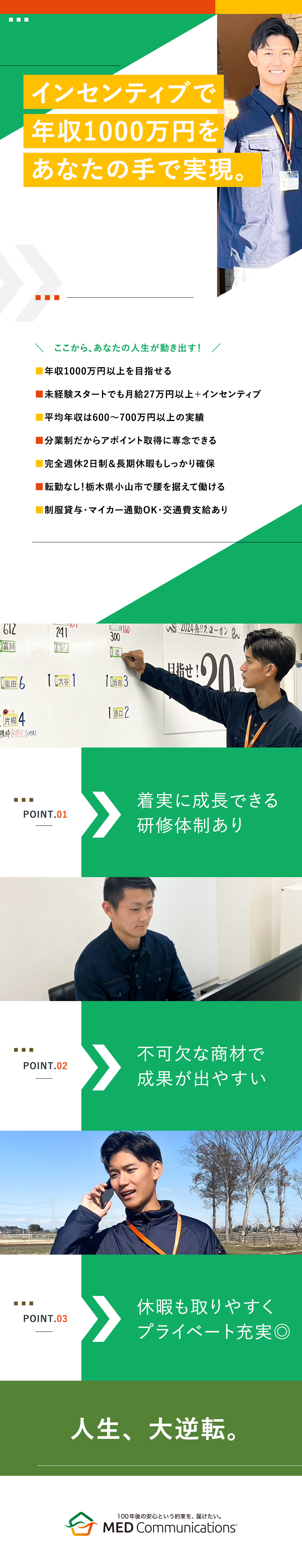 さらに、全国で事業を展開するMED Communicationsグループの一員となり、塗装・内装工事といったリフォーム事業も順調に成長中。複数の専門事業を軸に拡大を続ける成長企業の安定した基盤のもと、腰を据えて働くことができます。