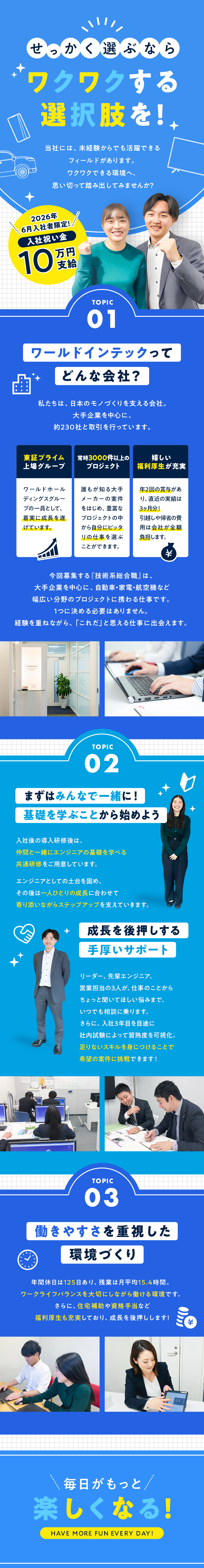 今回は技術系総合職としての採用のため、入社後の研修を通じて配属先を決めていく仕組み。そのため、何がやりたいか具体的に決まっていなくても大丈夫。「機械が好き」「何かを作ることが好き」という好奇心があれば、ゼロから活躍できます。上司や営業担当との定期的な面談もあり、理想のキャリアへ着実に近づくことが可能。働きやすさも整っているため、安心してスタートできそうです。