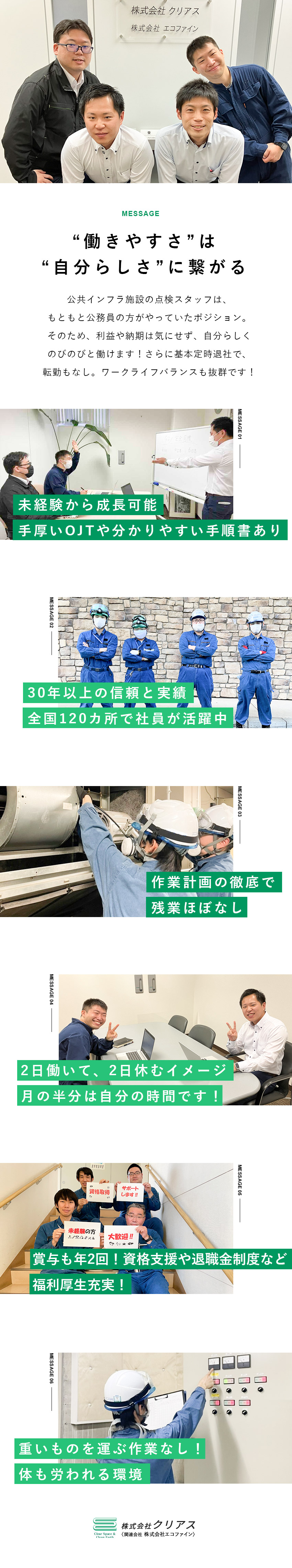 公共インフラの点検スタッフ/定時退社/未経験歓迎/賞与年2回