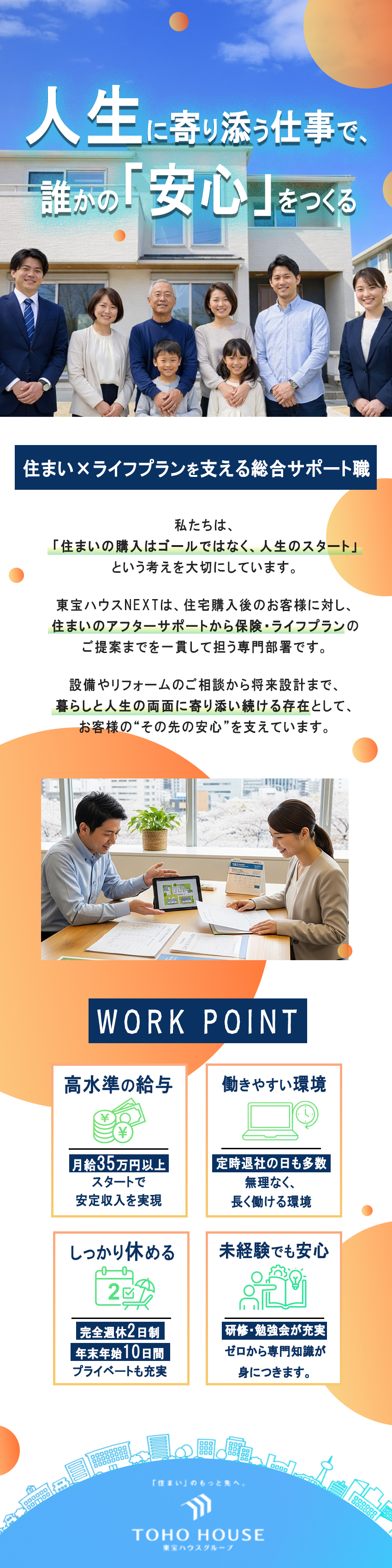 不動産業界というと「営業」「ノルマ」というイメージを持つ方も多いかもしれません。しかし、この仕事は「売る」仕事ではありません。住宅を購入されたお客様が、その後も安心して暮らせるようサポートする。いわば「住まいのコンシェルジュ」です。