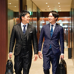 案件は主担当が責任を持つ一方、重要な局面では先輩が同行してフォローします。同行が評価制度にも組み込まれているため、本気で支援する文化が根付いており、安心して難度の高い仕事に挑戦できる環境です。