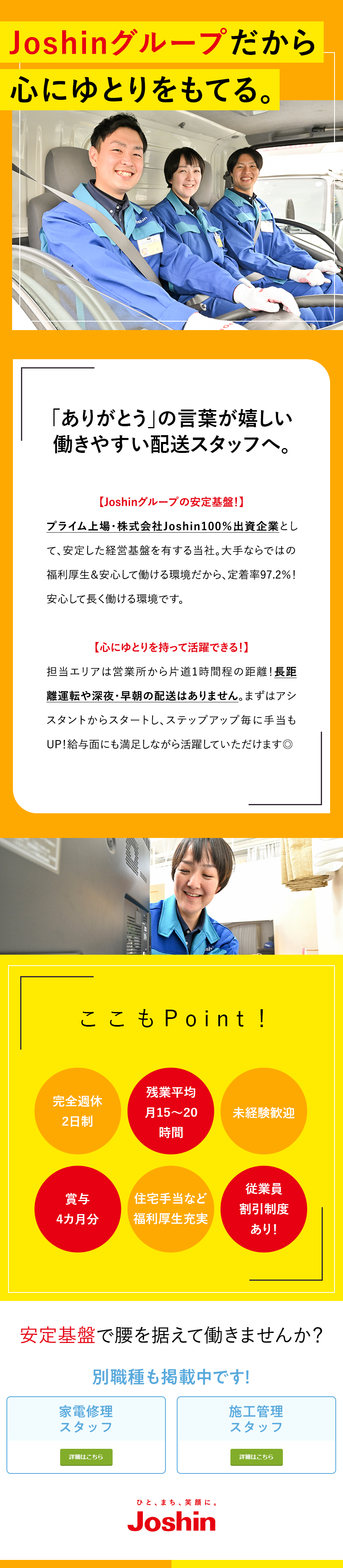 ジョーシンの配送スタッフ/賞与4カ月/完休2日/定着率97%