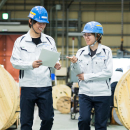 入社後まずは工場内で安全に働くための教育からスタート。その後、OJT研修に移行します。先輩社員が基礎から1つ1つ丁寧にレクチャーするので、未経験からでもスキルがきちんと身に付く環境です。電線・ケーブル製品の特性や、機械の操作方法など、少しずつ知識・ノウハウを増やしていきましょう!