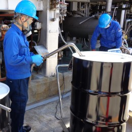 蒸留装置から完成した成分をドラム缶などに充填して出荷準備を行います。