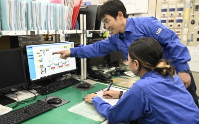 作業はチームに分かれて行います。【蒸留】の知識がなくても、チームリーダーやベテランの先輩について、現場で実際の作業に触れながら、【蒸留】をイチから習得できます。入社から1年程度は常に先輩と同行して業務を覚えます。