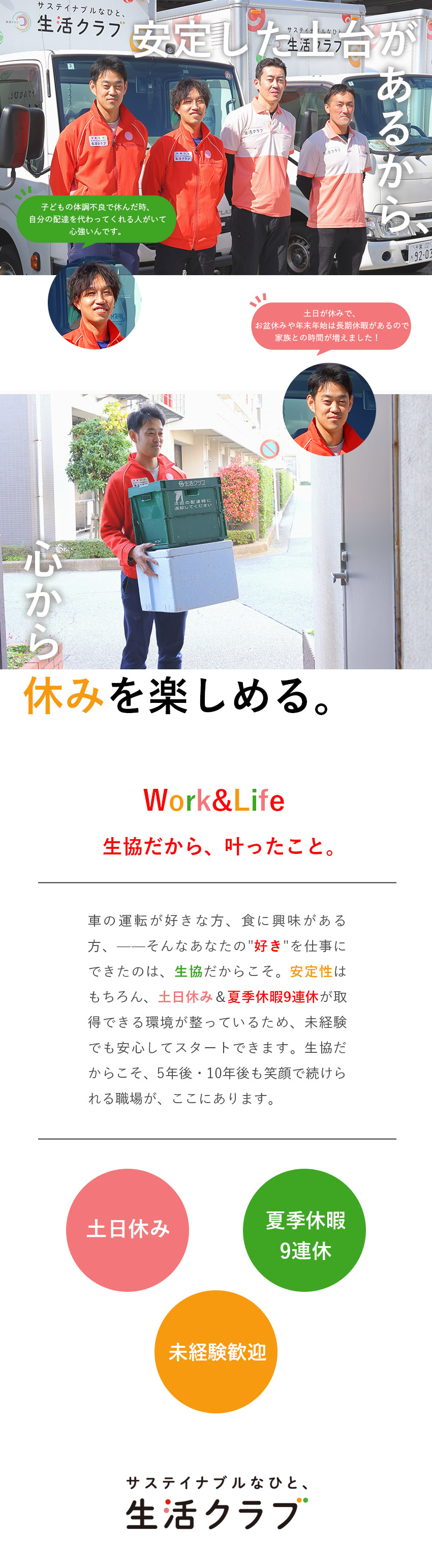 【安定性◎】設立50年/生協の安定基盤あり/【スタイル】毎週同じルートの短距離配送OK/【環境】賞与年3回/土日休み/夏季休暇9連休/生活クラブ生活協同組合