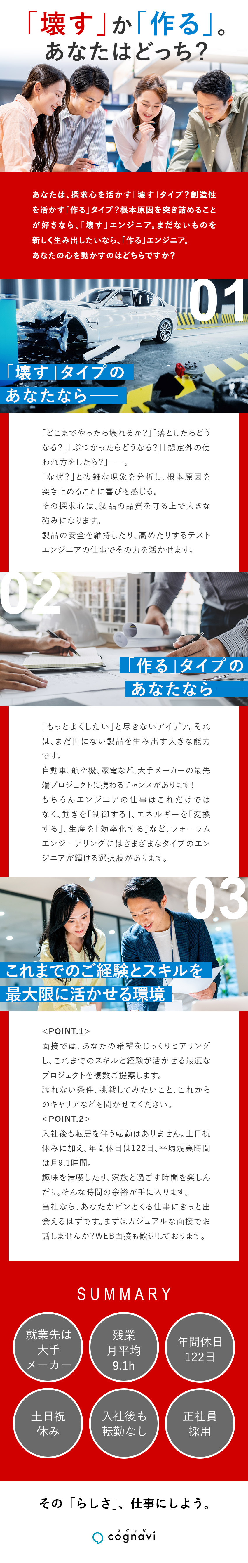 製造・整備士・施工管理の経験が活かせる案件が多数/入社後も転勤なし・通勤圏内の大手メーカーのみご紹介/平均残業月9.1h・土日祝日休みなど働きやすい環境/株式会社フォーラムエンジニアリング/コグナビ