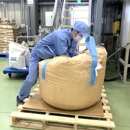 段ボール箱やクラフト袋に詰め、パレットと呼ばれる板に載せます。