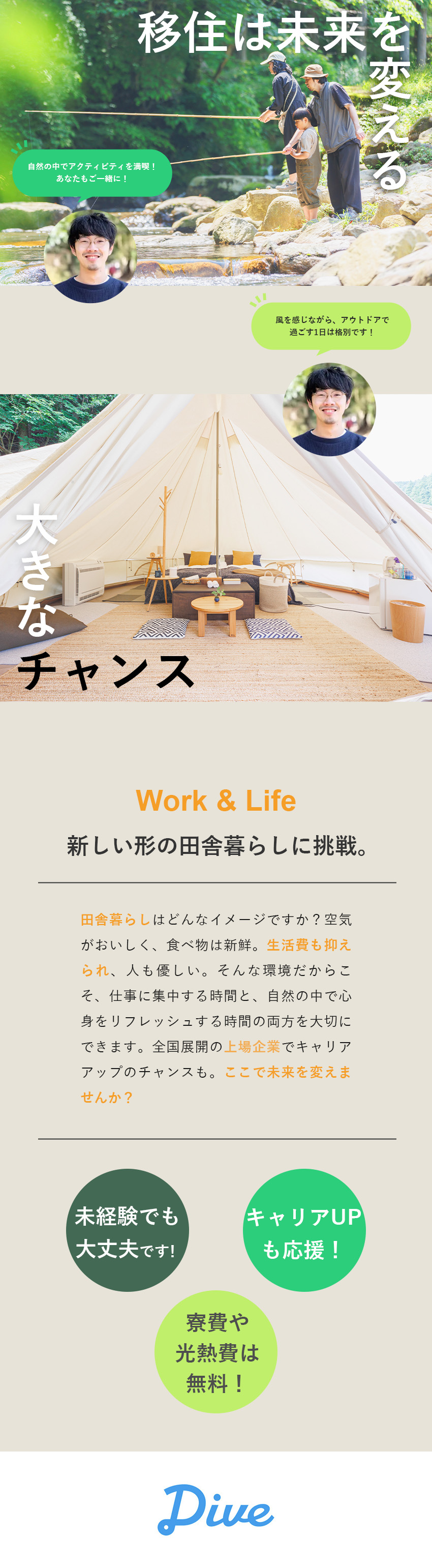 キャンプ・グランピング施設スタッフ/賞与年2回/寮光熱費無料