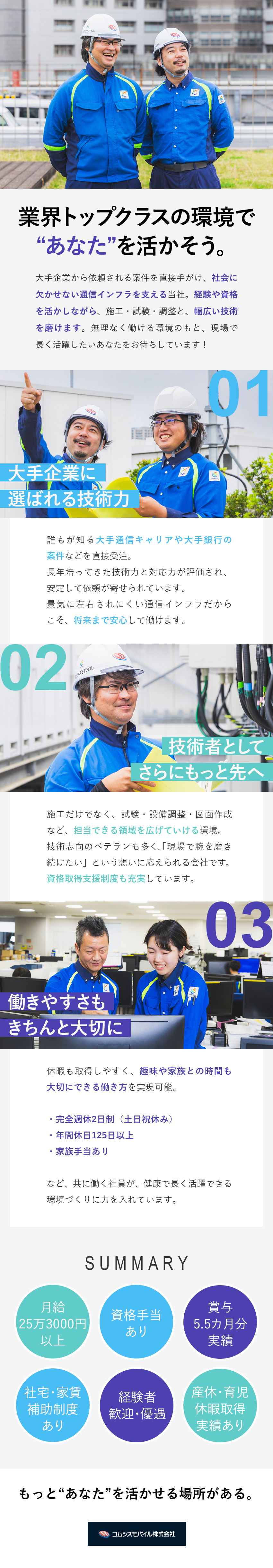 通信設備の工事スタッフ/経験者優遇/月給25万3000円以上