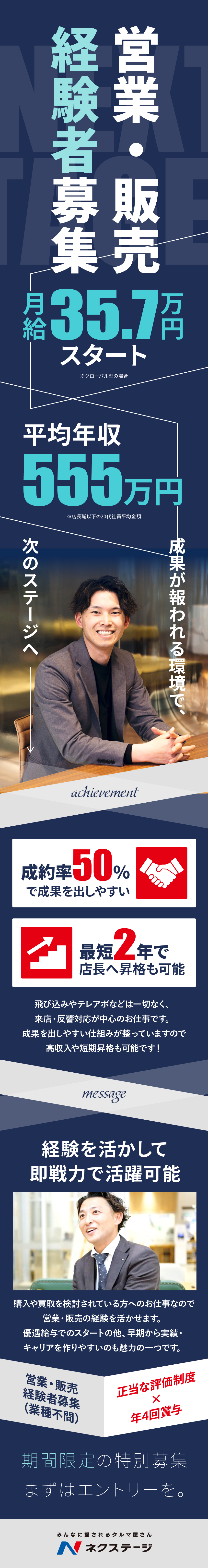 注目してほしいのが、安定した固定給に加え、出した成果に応じて《年4回の賞与》でしっかり還元してくれる点。20代社員の"平均"年収は555万円の実績を誇っています。同社では最短2年で店長へ昇格した事例もあり、正当に評価してくれることは間違いないです。