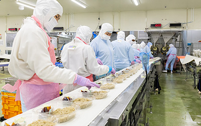 └「ざる蕎麦」「冷し中華」「焼そば」など常時30~40種類の麺製品を製造。「新しい価値の創造」を企業理念として、おいしさ・高品質・安心と安全を追求。幸せを実現し、社会の発展に貢献します。