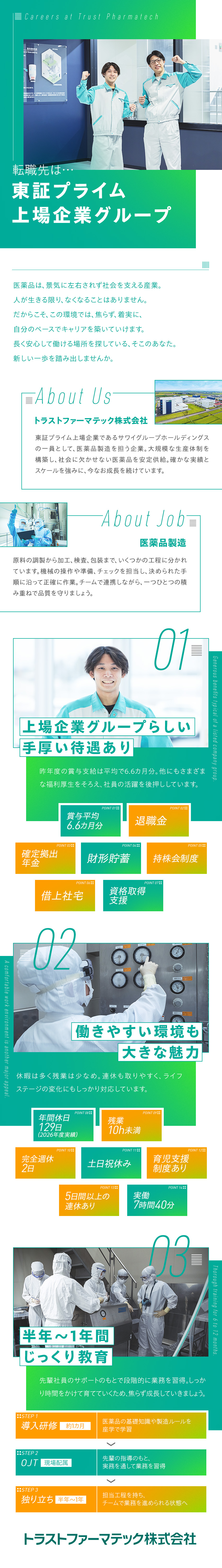 医薬品の製造/残業10h未満/土日祝休み/借上社宅/退職金