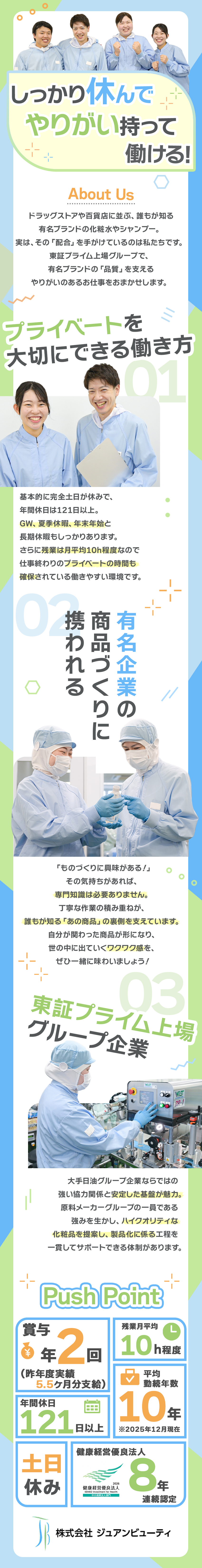 大手OEM化粧品の製造スタッフ/年休121日/月残業10h