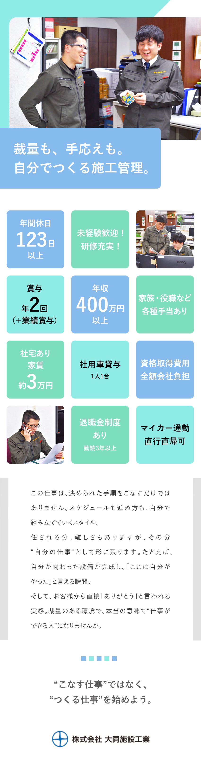 給排水・空調などの施工管理/未経験歓迎/土日祝休/賞与年3回