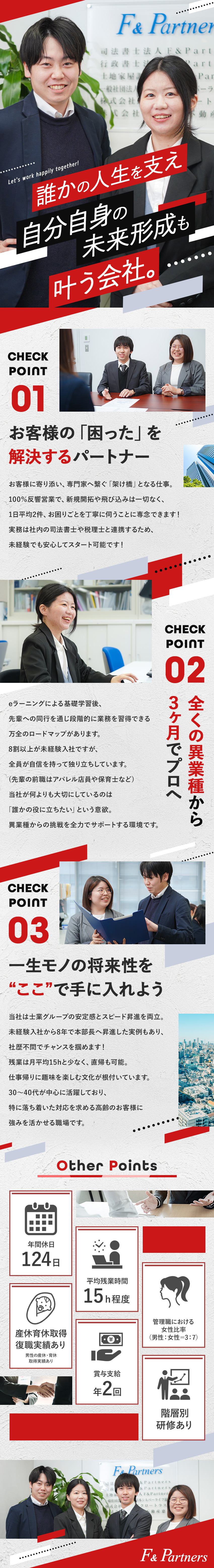 未経験から法律の知識もないまま、不安いっぱいでチャレンジしましたが、入社後は手厚いOJTもあって、何も不安なくスタートすることができました。 未経験からでも成長できる環境なので安心してご応募ください!